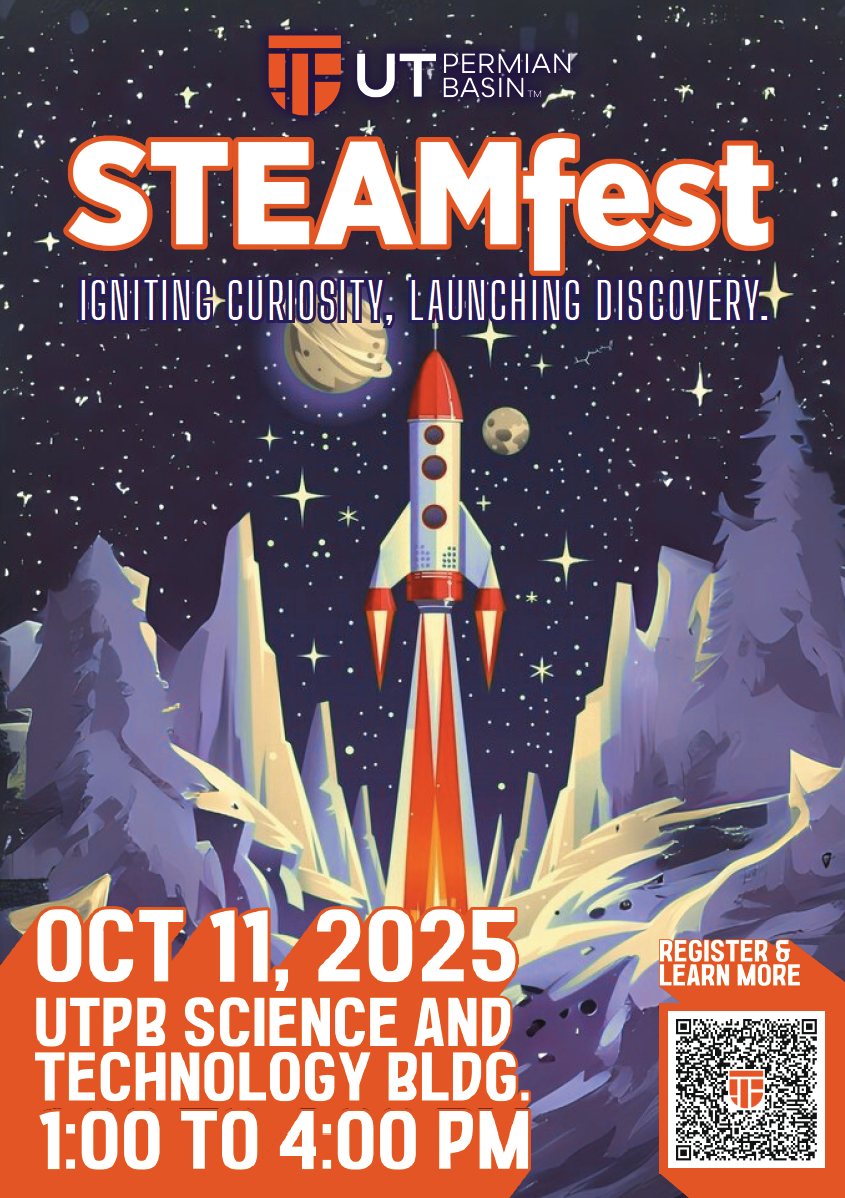 STEAMfest is back and bigger than ever! Join us at UT Permian Basin for a dynamic community event that brings Science, Technology, Engineering, Arts, and Mathematics to life through interactive exhibits, live demonstrations, and hands-on activities. This year’s event will spotlight creativity, collaboration, and innovation across all STEAM fields.
